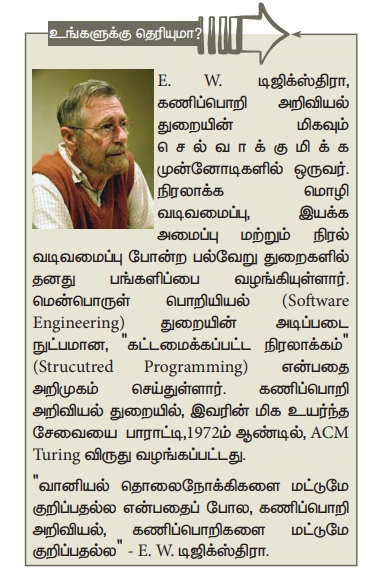E. W. டிஜிக்ஸ்திரா, கணிப்பொறி அறிவியல் துறையின் மிகவும் செல்வாக்கு மிக்க முன்னோடிகளில் ஒருவர். நிரலாக்க - மொழி வடிவமைப்பு, இயக்க அமைப்பு மற்றும் நிரல் வடிவமைப்பு போன்ற பல்வேறு துறைகளில் தனது பங்களிப்பை வழங்கியுள்ளார். மென்பொருள் பொறியியல் (Software Engineering) துறையின் அடிப்படை நுட்பமான, “கட்டமைக்கப்பட்ட நிரலாக்கம்” (Strucutred Programming) அறிமுகம் செய்துள்ளார். கணிப்பொறி அறிவியல் துறையில், இவரின் மிக உயர்ந்த சேவையை பாராட்டி,1972ம் ஆண்டில், ACM Turing விருது வழங்கப்பட்டது.