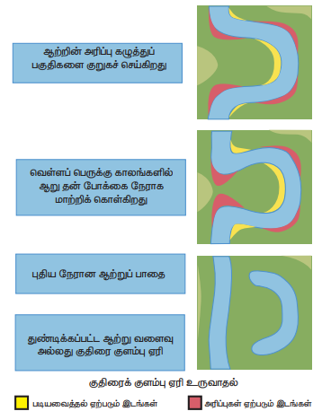 ஆறானது சமவெளிப் பகுதியை அடையும் போது நீரின் அலைதலால் ஆற்றில் வளைவுகள் தோன்றுகின்றன. ஆறு வளைந்து மற்றும் சுழன்று செல்வதால் தோன்றும் பெரிய வளைவுகள் ஆற்று வளைவுகள் (Meanders) எனப்படுகின்றன. உதாரணம்: தமிழ்நாட்டில் கடலூர் மாவட்டத்தில் சேத்தியாத்தோப்பு அருகே வெள்ளாற்று பகுதியில் ஆற்று வளைவுகள் காணப்படுகின்றன. ஆற்று வளைவுகளின் (Meanders) இருபக்கங்களிலும் தொடர்ந்து அரித்தல் மற்றும் படிதல் ஏற்படுவதால், ஆற்று வளைவின் கழுத்துப் பகுதிகள் நெருங்கி வருகின்றன. நாளடைவில், ஆற்று வளைவு ஆற்றிலிருந்து துண்டிக்கப்பட்டு ஒரு ஏரியாக உருவெடுக்கின்றது. இதுவே குதிரைக் குளம்பு ஏரி (Oxbow lake) எனப்படுகிறது.