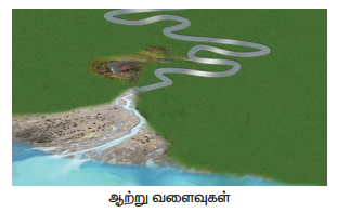 6. ஆற்று வளைவு - Meander - ஆறானது சமவெளிப் பகுதியை அடையும் போது அது சுழன்று பெரிய திருப்பங்களுடன் செல்வதால் தோன்றும் பெரிய வளைவுகள் ஆற்று வளைவுகள் (Meander) எனப்படுகின்றன.