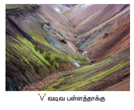 ஆற்று நீரானது செங்குத்து சரிவைக் கொண்ட மலைப் பிரதேசத்தை அரிப்பதால் அங்கு ஆழமான V வடிவ பள்ளத்தாக்குகளை உருவாக்குகிறது.