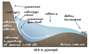 • ஈர்ப்பு விசையின் காரணமாக மலைச்சரிவின் கீழ் நோக்கி மெல்ல நகரும் பனிக்குவியல் பனியாறுகள் எனப்படுகின்றன.