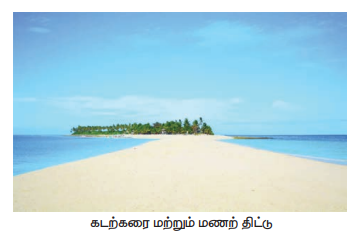 • கடல் அலைகளால் மணல் மற்றும் சரளைகள் படிந்துள்ள கடலோரப்பகுதி கடற்கரை எனப்படும்.
