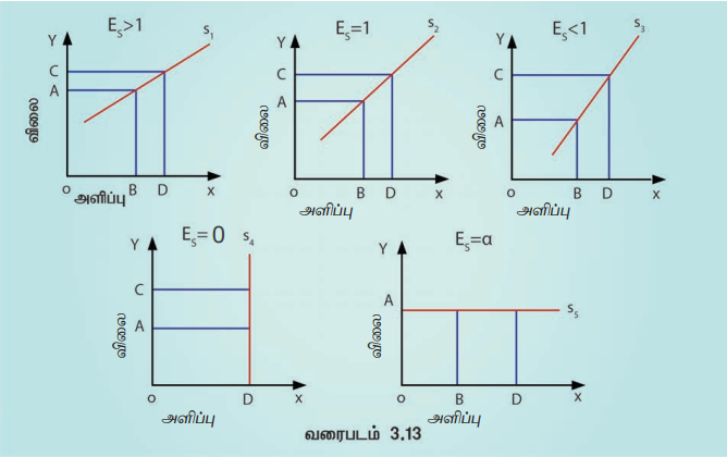es=( ΔQs/Qs) / (ΔP/P); es = ΔQs / ΔP x P/Qs இதில் Q, என்பது அளிப்பு, P என்பது விலை, Δ என்பது மாற்றம்.
