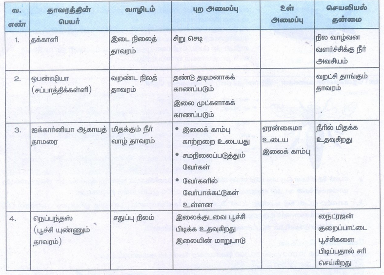 கொடுக்கப்பட்டுள்ள தாவரங்கள் கண்டறியப்பட்டு அவைகளின் தகவமைப்புகள் குறிக்கப்படுகின்றன