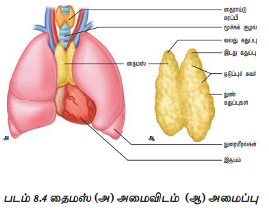 தட்டையான இரண்டு கதுப்புகளை கொண்ட தைமஸ், மார்பெலும்புக்குப் பின்புறமும் இதயத்திற்கு மேலாகவும் அமைந்துள்ளன. தைமசின் ஒவ்வொரு கதுப்பும் பல எண்ணற்ற நுண் கதுப்புகளால் ஆக்கப்பட்டுள்ளது. நுண்கதுப்புகளை இணைப்புத் திசுவால் ஆன தடுப்புச்சுவர்பிரிக்கிறது. ஒவ்வொரு நுண்கதுப்பும் கார்டெக்ஸ் என்னும் புற அடுக்கையும் மெடுல்லா என்னும் அக அடுக்கையும் கொண்டுள்ளன. கார்டெக்ஸ் பகுதியில் தைமோசைட்டுகள் என்னும் முதிர்ச்சியடையாத செல்கள் அடர்ந்து காணப்படுகின்றன. மெடுல்லாவில் குறைந்த அளவிலான முதிர்ச்சியடைந்த தைமோசைட்டுகள் காணப்படுகின்றன. தைமஸிலிருந்து தைமோசின் என்னும் மிக முக்கிய ஹார்மோன் உற்பத்தியாகிறது. அது 'T' செல்களைத் தூண்டி அவற்றை முதிர்ச்சியடையச் செய்கிறது மற்றும் தடைகாப்பு திறன் பெற்ற செல்களாக மாற்றுகின்றன. பதின்பருவத்தின் தொடக்கத்தில் இச்சுரப்பி செயல் நலிவுறுகிறது. அவ்விடத்தில் அடிபோஸ் திசு பதிலீடாக வளர்கிறது. பிறந்த குழந்தைகளிலும் விடலைப்பருவத்தினரிடத்திலும் தைமஸ் அதிக செயல்திறனுடன் செயல்புரிகிறது (படம் 8.4).