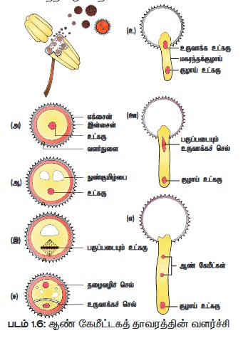 சூலகமுடியை அடைந்த மகரந்தத்துகள் ஈரப்பசையை உறிஞ்சி உப்புதலடைகிறது. இன்டைன் வளர்துளையின் வழியாக மகரந்தக் குழாயாக வளர்கிறது. இரண்டு செல் நிலையில் மகரந்தத்துகள் வெளியேற்றப்பட்டிருப்பின் சூலக முடியை அடைந்த பின் அல்லது மகரந்தக்குழாய் கருப்பையை அடையும் முன்னர் உருவாக்க செல் பகுப்படைந்து இரு ஆண் செல்களைத் (விந்துக்கள் ) தருகிறது. ஆண் கேமீட்டகத் தாவரத்தின் வளர்ச்சி நிலைகள் படம் 1.6-ல் கொடுக்கப்பட்டுள்ளன.