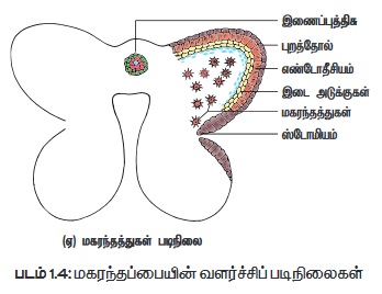 ஒருமடிய நுண்வித்துகளைத் தோற்றுவிக்கின்றன (நான்கமை நுண்வித்து). இந்த நான்கமை வித்துக்கள் நான் முகப்பு , குறுக்கு மறுக்கு , நேர்கோட்டு, இருமுகப்பு , T வடிவ அமைப்பில் உள்ளது. நுண்வித்துக்கள் விரைவில் ஒன்றிலிருந்து மற்றொன்று பிரிந்து தனித்தனியாக மகரந்தப்பை அறையில் காணப்படுகின்றன மற்றும் மகரந்தத்துகள்களாக வளர்கின்றன. நுண்வித்தகங்களின் வளர்ச்சியிலுள்ள படிநிலைகள் படம் 1.4-ல் கொடுக்கப்பட்டுள்ளன. சில தாவரங்களில் ஒரு நுண்வித்தகத்திலுள்ள நுண்வித்துகள் அனைத்தும் ஒன்றாக இணைந்து பொலினியம் (pollinium) என்ற அமைப்பை பெற்றுள்ளது. எடுத்துக்காட்டு: எருக்கு . கூட்டு மகரந்தத்துகள் டுரோசீரா, டிரைமிஸ் ஆகிய தாவரங்களில் காணப்படுகின்றன.
