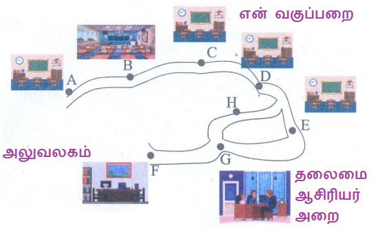 1. உங்கள் பள்ளியின் வரைபடத்தை வரைந்து தலைமை ஆசிரியர் அறைக்கும் உங்கள் வகுப்பறைக்கும் உள்ள வழித்தடங்களைக் குறிப்பிடுக.