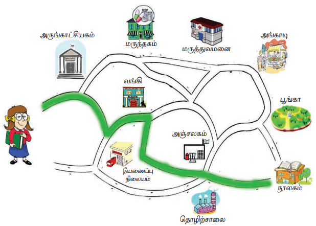 1. படத்தில் கொடுக்கப்பட்டுள்ள வழித்தடத்தில் அவள் கடந்து வந்த இடங்களைக் குறிப்பிடவும்.