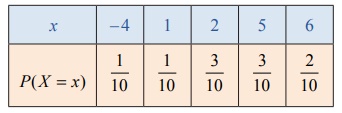 6, 2, 5, 5, 2, 6, 2, − 4, 1, 5 ஆகிய 10 எண்களையும் சமவாய்ப்பு மாறி X-ன் மதிப்புகளாக கருதினால் நிகழ்தகவு நிறை சார்பு