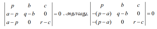 px + by + cz = 0, ax + qy + cz = 0, ax + by + rz = 0 என்ற தொகுப்பின் சமன்பாடுகள் வெளிப்படையற்றத் தீர்வு பெற்றுள்ளது என்க.