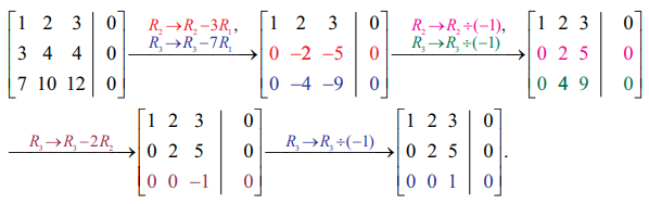x + 2y + 3z = 0, 3x + 4y + 4z = 0, 7x + 10y + 12z = 0.