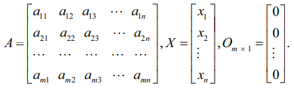 மேல் உள்ள தொகுப்பை AX = Om × 1, என்ற அணிவடிவில் எழுதலாம். இங்கு
