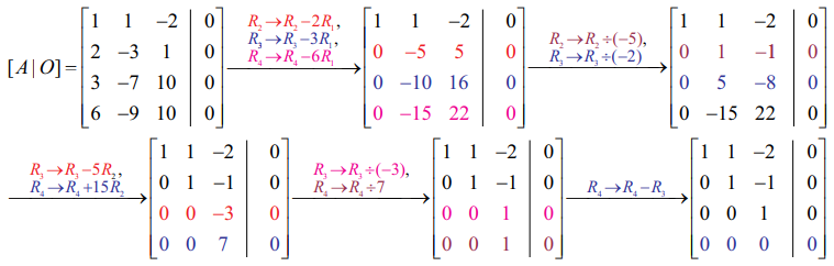 எனவே ρ (A) = ρ ([A | O]) = 3 = மதிப்பிட வேண்டிய மாறிகளின் எண்ணிக்கை. ஆதலால், தொகுப்பிற்கு வெளிப்படைத் தீர்வு மட்டும்தான் உண்டு.
