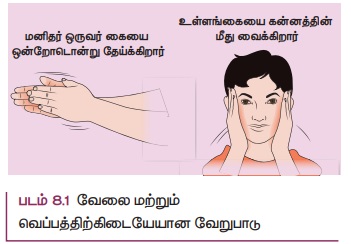 உங்களின் இரண்டு உள்ளங்கைகளையும் ஒன்றுடன் ஒன்று தேய்க்கும் போது, அவற்றின் வெப்பநிலை உயர்வதை காணலாம். உங்கள் உள்ளங்கைகளின் மீது ஒரு வேலை செய்யப்படுகிறது. அந்த செய்யப்பட்ட வேலையால்தான் வெப்பநிலை உயர்ந்துள்ளது. தற்போது உங்கள் உள்ளங்கைகளை கன்னத்தின் மீது வைக்கும் போது, கன்னத்தின் வெப்பநிலை உயர்வதைக் காணலாம். ஏனென்றால் உள்ளங்கைகளில் வெப்பநிலை கன்னத்தின் வெப்பநிலையை விட அதிகம். அதனால் வெப்பம் உள்ளங்கையிலிருந்து கன்னத்திற்கு பாய்கிறது. மேலே கூறப்பட்ட எடுத்துக்காட்டிலிருந்து நாம் அறிவது என்னவென்றால் உள்ளங்கைகளின் வெப்பநிலை உயர்ந்தது செய்யப்பட்ட வேலையினால் கன்னத்தின் வெப்பநிலை உயர்ந்தது உள்ளங்கைகளிலிருந்து, கன்னத்திற்கு வெப்பம் பரிமாற்றப்பட்டதால் தான் இவை படம் (8.1) இல் காட்டப்பட்டுள்ளன.