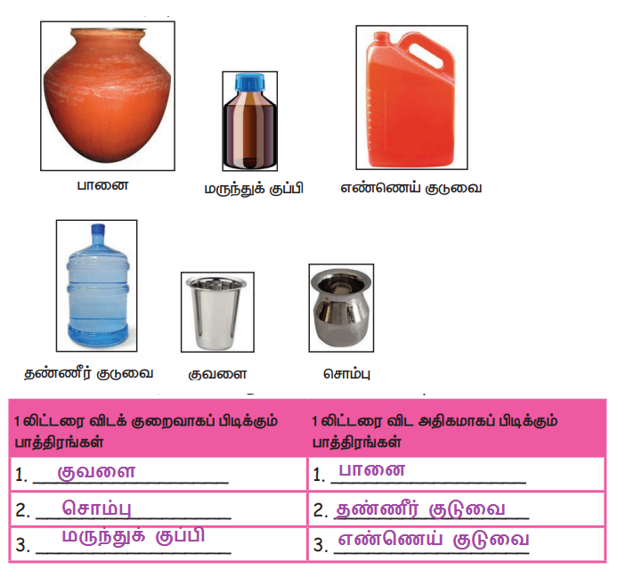 6. கொடுக்கப்பட்டுள்ள கொள்கலன்களை நிரப்புவதற்கு எவ்வளவு தண்ணீர் தேவைப்படும் ஒரு லிட்டர் புட்டியைக் கொண்டு அளந்து அட்டவணையை நிறைவு செய்க