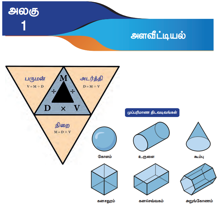 * ஒழுங்கான மற்றும் ஒழுங்கற்ற பொருள்களின் பரப்பளவு மற்றும் கன அளவினைக் கண்டறியும் முறையினை அறிதல்