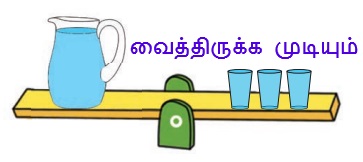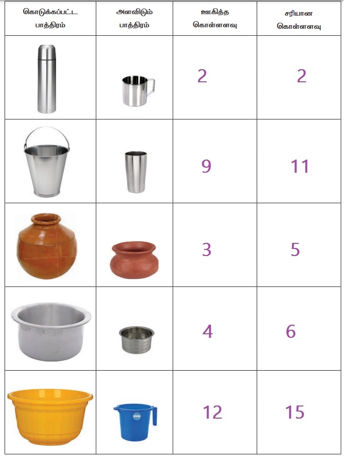 கொடுக்கப்பட்டுள்ள பாத்திரத்தின் கொள்ளளவினை அளவிடும் பாத்திரத்தைக் கொண்டு ஊகிக்க. உமது ஊகம் சரியானவையா என் அளந்து பார்த்துக் கண்டறிக.