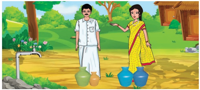 கமலி மற்றும் கண்ணன் இருவரும் குழாயிலிருந்து 2 குடம் தண்ணீர் பிடித்துவரச் செல்கின்றனர். படத்தை உற்றுநோக்கி, யார் அதிகத் தண்ணீர் பிடிப்பர் எனக் கூறுக.