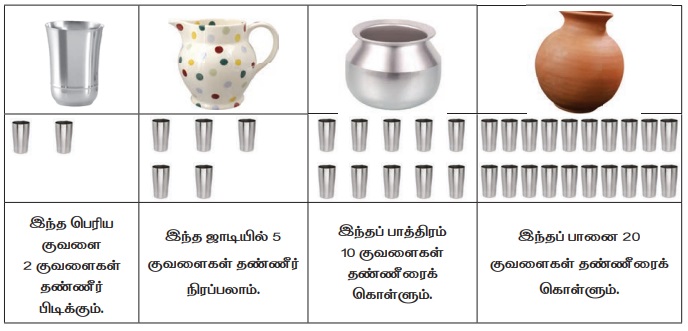 1 ஜாடி 3 குவளைகள் தண்ணீரை கொள்ளும் எனில், பின்வருவனவற்றின் கொள்ளளவினைக் காண்க.