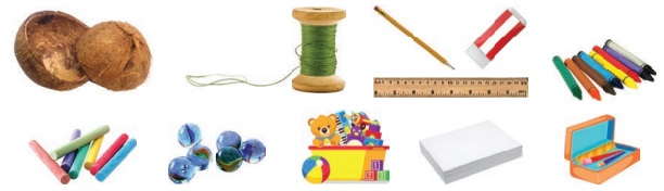 வண்ண மெழுகு, சுண்ணாம்புக் கட்டி, காகிதம், கரிக்கோல் பெட்டி, பலகை,