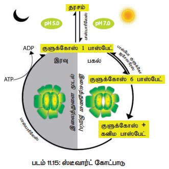 ஈ) ஸ்டீவார்ட் (1964) சற்று மாற்றியமைக்கப்பட்ட தரச- சர்க்கரை இடைமாற்ற கோட்பாட்டினை முன்மொழிந்தார். இதன்படி குளுக்கோஸ் -1- பாஸ்பேட் சவ்வூடுபரவல் தன்மையற்றது. குளுக்கோஸ்-1- பாஸ்பேட்டில் உள்ள பாஸ்பேட்டை நீக்குவதால் அது குளுக்கோஸாக மாறுகிறது. குளுக்கோஸின் சவ்வூடுபரவல் திறன் தன்மையால் காப்பு செல்லினுள் இதன் செறிவு அதிகரித்து இலைத்துளை திறக்கிறது (படம் 11.15).