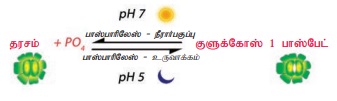 பாஸ்பாரிலேஸ் நொதி தரசத்தினை நீராற்பகுத்து சர்க்கரையாக மாற்றி pH- அளவை உயர்த்துவதால்