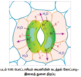 இ) புரோட்டான்கள் சவ்வின் வழியாக அருகமைந்த துணை செல்களுக்கும், துணை செல்களிலிருந்து பொட்டாசியம் அயனிகள் (K+) காப்பு செல்களுக்கும் பரிமாற்றம் செய்து கொள்கின்றன. இது மின் சரிவு வாட்டத்தின் வழியாக (Electrical Gradient) நடைபெறுவதால் இது அயனிப்பரிமாற்றம் (lon Exchange) எனப்படுகிறது.