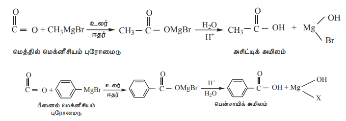 கிரிக்னார்டு வினைக்காரணியானது கார்பன் டையாக்சைடுடன் (உலர் பனிக்கட்டி) வினைபுரிந்து கார்பாக்சிலிக் அமில உப்புகளை உருவாக்குகின்றன, இவற்றை கனிம அமிலங்களைக் கொண்டு நீராற்பகுக்கும் போது கார்பாக்சிலிக் அமிலங்கள் கிடைக்கின்றன.