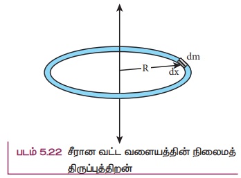 m நிறையும் R ஆரமும் கொண்ட சீரான நிறை அடர்த்தி கொண்ட வட்ட வளையத்தைக் கருதுக. வட்ட வளையத்தின் தளத்திற்கு செங்குத்தாகவும், அதன் மையம் வழிச்செல்லும் அச்சைப் பொருத்து நிலைமத் திருப்புத்திறனைக் காண அவ்வளையத்திலிருந்து மீநுண்நிறை dm ஆனது மிகச் சிறிய நீளம் dx தொலைவில் இருப்பதாக கொள்வோம். இதில் dm ஆனது R தொலைவில் உள்ளது எனக்கொண்டால், அத்தொலைவு படம் 5.22 இல் காட்டப்பட்டது போல் அச்சிலிருந்து வளையத்தின் ஆரத்தைக் குறிக்கிறது.
