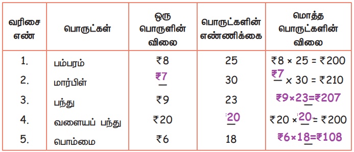 ஒன்றின் விலை கூடுதல், மொத்த மதிப்பு, மீதம் இவற்றிற்கான கணித செயல்பாடுகளைப் பயன்படுத்துதல்.,