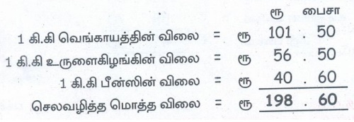 அன்பு சந்தைக்கு சென்று 1 கி.கி வெங்காயம் ரூ.101.50-க்கும், 1 கி.கி உருளைக்கிழங்கு ரூ.56.50-க்கும், 1 கி.கி பீன்ஸ் ரூ 40.60-க்கும் வாங்கினான் எனில் அவன் செலவழித்த தொகை எவ்வளவு?