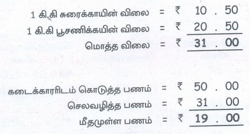 ஆல்வின் மளிகைக் கடைக்குச் சென்று 1 கி.கி சுரைக்காய் ரூ.10.50-க்கும், 1 கி.கி பூசணிக்காய் ரூ.20.50-க்கும் வாங்கினான். அவன் கடைக்காரரிடம் ரூ.50.00 கொடுத்தான் எனில் மீதி எவ்வளவு பணம் கடைக்காரர் திரும்பிக் கொடுத்தார்?