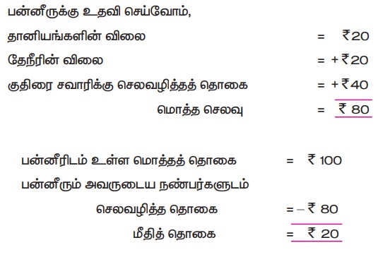 பன்னீரும் அவருடைய நண்பர்களும் தானியத்திற்காக ₹ 20, தேநீருக்காக ₹ 20, குதிரை சவாரிக்காக ₹ 40 செலவழித்தனர். மகிழ்ச்சியாக வீட்டிற்குச் சென்றனர். பின்னர், பன்னீர் வீட்டிற்குச் சென்று ₹ 100 இல் மீதமுள்ள பணத்தைக் கணக்கிட்டான்.
