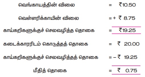 செல்வம் காய்கறிகடைக்குச் சென்று வெங்காயம் ₹ 10.50 இக்கும், வெள்ளரிக்காய் ₹8.75 வாங்கினான். கடைக்காரரிடம் ₹ 20 கொடுத்தான் எனில், அவன் பெற்ற மீதித் தொகை எவ்வளவு?