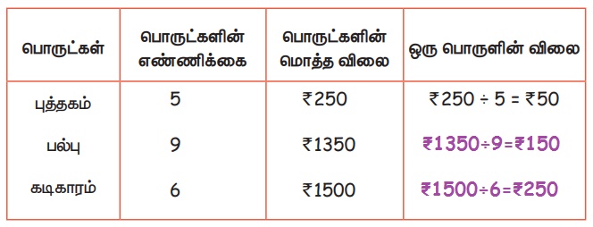 மொத்த விலைக் கொடுக்கப்பட்டிருக்கும் பொழுது ஒவ்வொரு பொருளின் விலையைக் காண்க. ஒன்று தங்களுக்காகச் செய்யப்பட்டுள்ளது.
