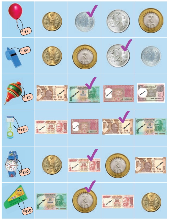 பொருள்களின் விலைக்கேற்ற நாணயம் அல்லது பணத்தாளினை (✔) செய்க.