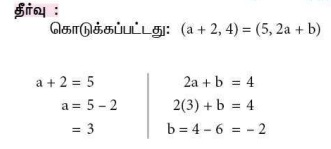 6. (a + 2, 4) மற்றும் (5,2a + b) ஆகிய வரிசைச் சோடிகள் சமம் எனில், (a, b) என்பது