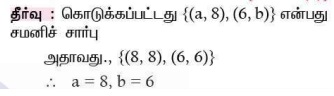 8. {(a, 8), (6, b)} ஆனது ஒரு சமனிச் சார்பு எனில், a மற்றும் b மதிப்புகளாவன முறையே