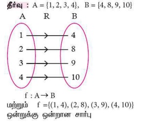 9. Let A = {1, 2, 3, 4} and B = {4, 8, 9,10} என்க. சார்பு f: A → B ஆனது f = {(1, 4),(2, 8),(3, 9),(4,10)} எனக் கொடுக்கப்பட்டால் f -என்பது