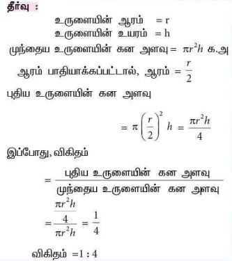 4. ஓர் உருளையின் உயரத்தை மாற்றாமல் அதன் ஆரத்தைப் பாதியாகக் கொண்டு புதிய உருளை உருவாக்கப்படுகிறது. புதிய மற்றும் முந்தைய உருளைகளின் கன அளவுகளின் விகிதம்