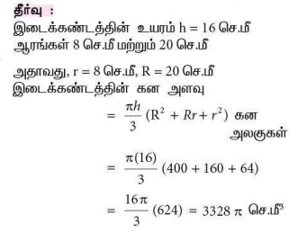 10. 16 செ.மீ உயரமுள்ள ஒரு நேர்வட்டக் கூம்பின் இடைக்கண்ட ஆரங்கள் 8 செ.மீ மற்றும் 20 செ.மீ எனில், அதன் கன அளவு