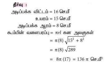 1. 15 செ.மீ உயரமும் 16 செ.மீ விட்டமும் கொண்ட ஒரு நேர்வட்டக் கூம்பின் வளைபரப்பு
