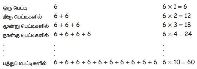 ஒரு பெட்டியில் 6 சாக்லேட்கள் இருந்தால், இதே போன்று 10 பெட்டிகளில் எவ்வளவு சாக்லேட்டுகள் இருக்கும்? பெட்டிகளில் உள்ள சாக்லேட்டுகளின் எண்ணிக்கையைக் கணக்கிடலாமா?
