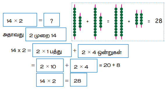 14 × 2 = 2 × 1 பத்து + 2 × 4 ஒன்றுகள்