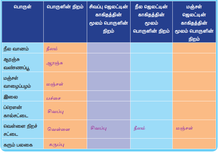 சிவப்பு நீலம் மற்றும் மஞ்சள் நிறம் கொண்ட ஜெலட்டின் காகிதங்களை எடுத்துக் கொள்ளுங்கள். ஒவ்வொரு வண்ண ஜெலட்டின் காகிதத்தையும் மூன்றாக மடித்துக் கொள்ளுங்கள். பின், அவை ஒவ்வொன்றின் மூலம் அட்டவணையில் கொடுக்கப்பட்டுள்ள ஒவ்வொரு பொருளையும் பார்க்கவும். பொருள்கள் கொண்ட வண்ணங்களை அட்டவணையில் எழுதுக.