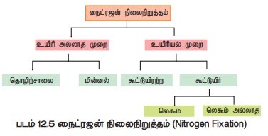 • ரைசோபியம் போன்ற கூட்டுறவு வாழ்க்கையில் ஈடுபடும் பாக்டீரியங்களின் மூலம் நிகழும் நைட்ரஜன் நிலைநிறுத்தம்.