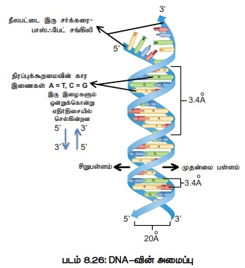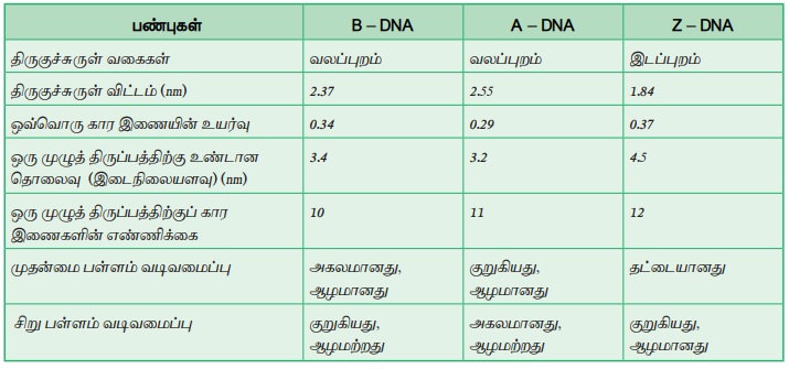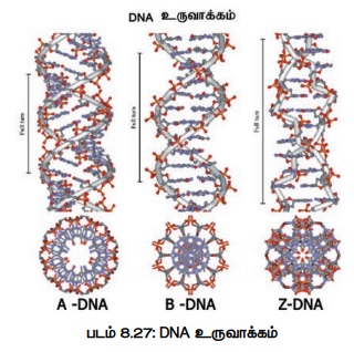 • திருகுசுருளின் ஒவ்வொரு சுற்றிற்கும் இடையேயுள்ள தூரத்தைக் கொண்டு DNA A - DNA, B- DNA மற்றும் Z-DNA என மூன்று வடிவங்களாக உள்ளன (படம் 8.27)
