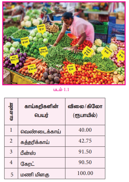 மணி, காய்கறிகளை வாங்குவதற்காகக் கடைவீதிக்குச் சென்றார். கீழ்க்காணும் அட்டவணையில் உள்ளவாறு ஐந்து விதமான காய்கறிகளின் விலைப்பட்டியல் அளிக்கப்பட்டுள்ளது.