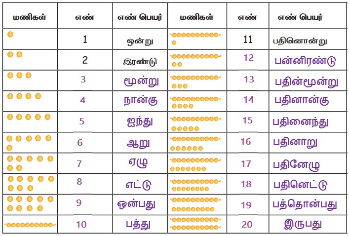 2. கொடுக்கப்பட்டுள்ள அட்டவணையில் மணிகளை எண்ணி, எண் மற்றும் எண் பெயரை எழுதி நிரப்புக.